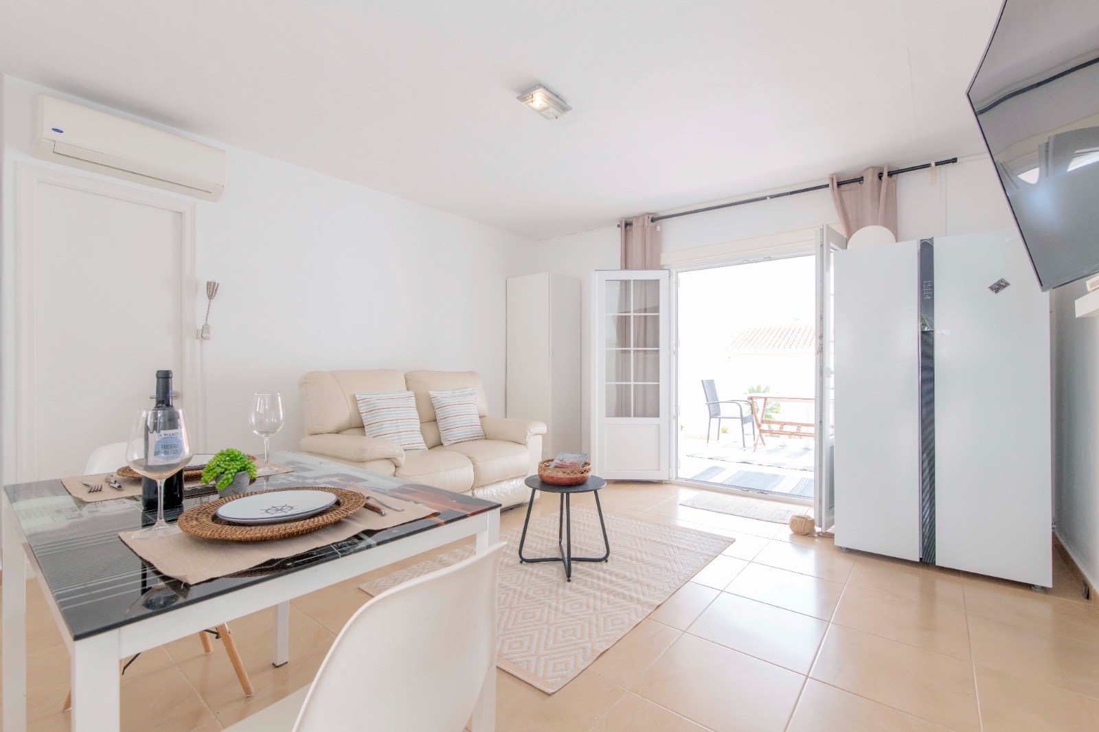 Inside, there is a spacious open-plan living-dining room and kitchen, with double doors leading out onto the terrace and pool area, 2 double bedrooms with fitted wardrobes, 1 single room and 2 bathrooms.