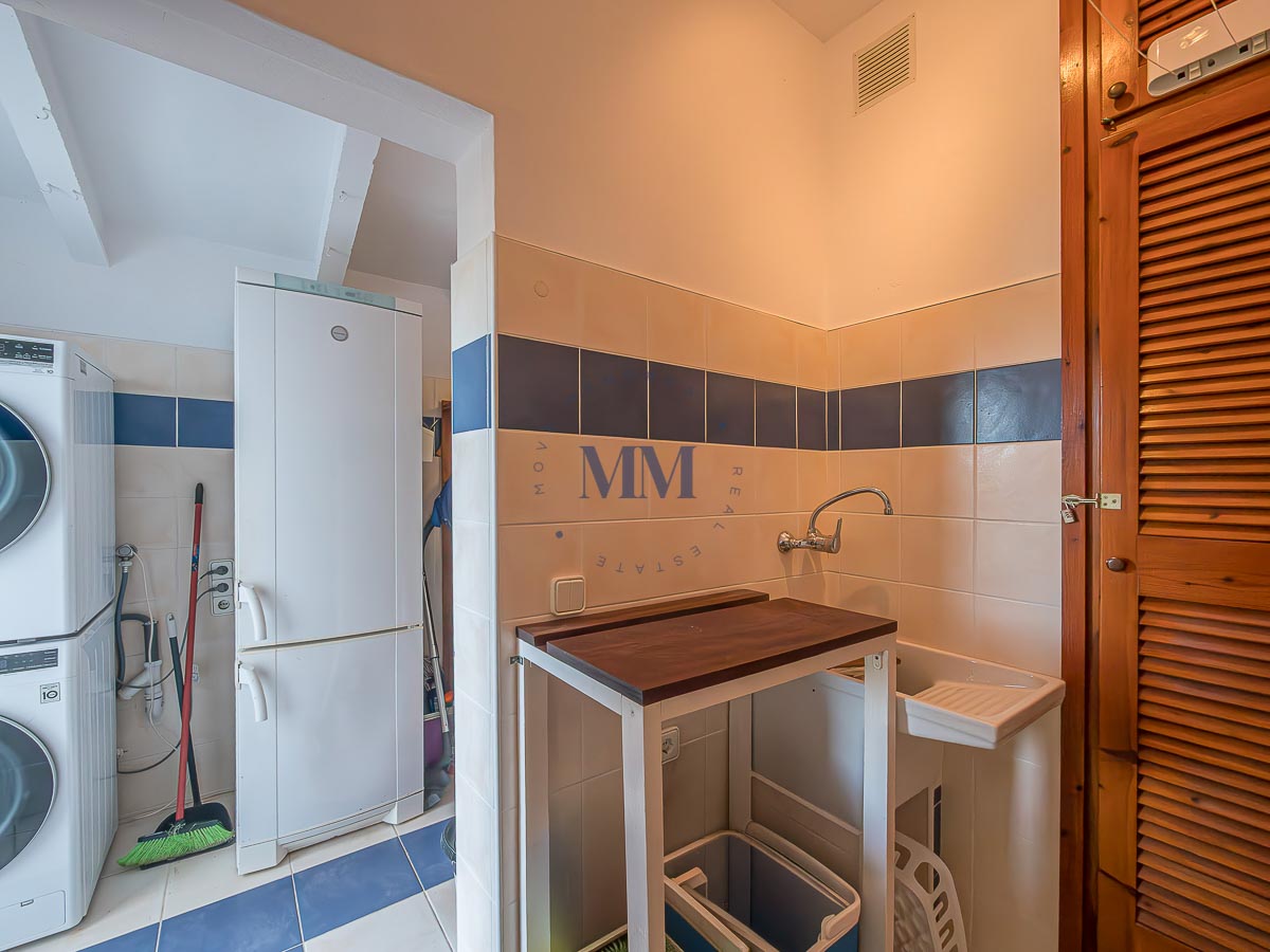 Outside, there is a large garden, a private swimming pool, a barbecue area, and pleasant distant sea views—perfect for relaxing and enjoying the Mediterranean surroundings. There is also a utility area with an outdoor shower.